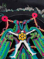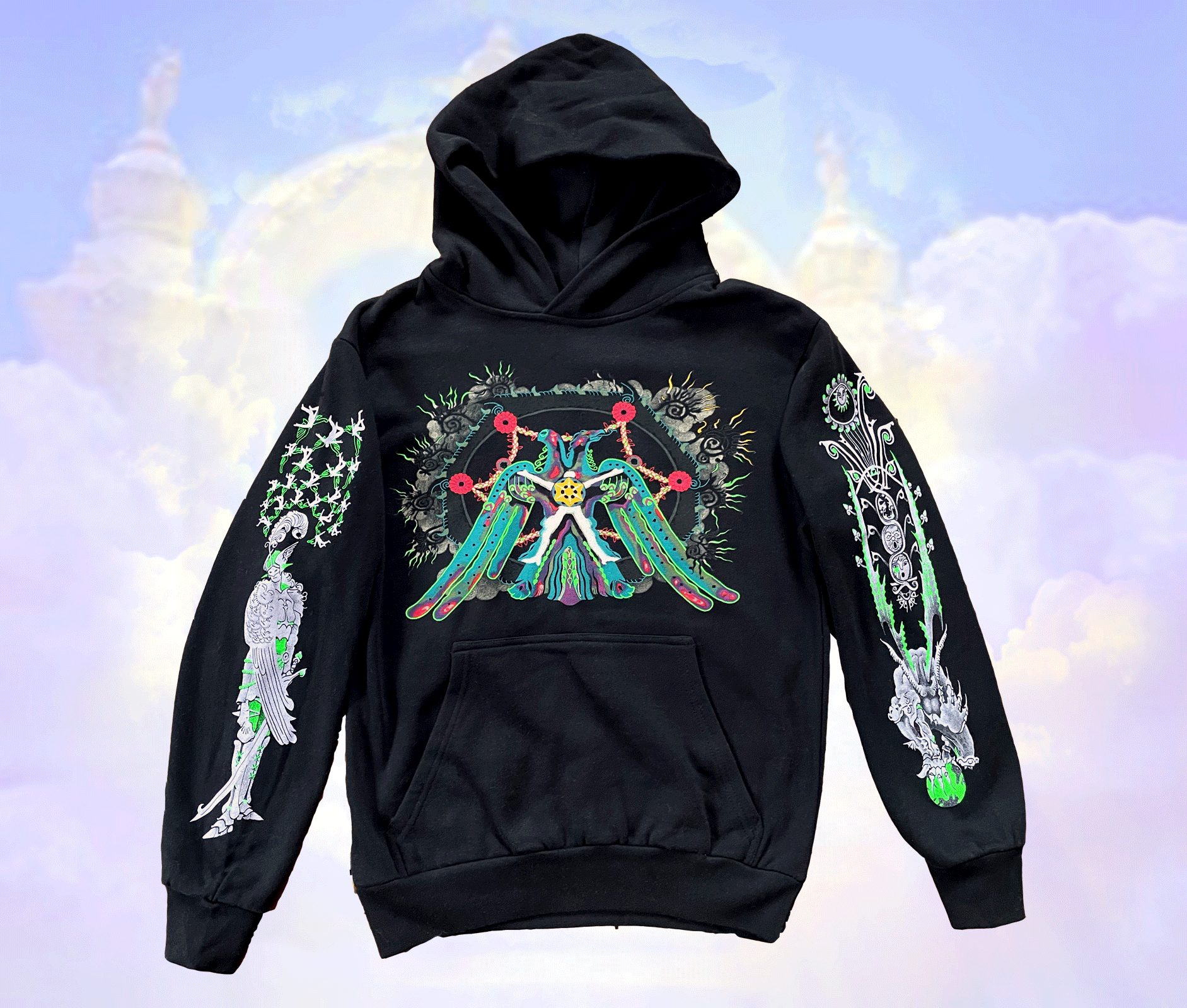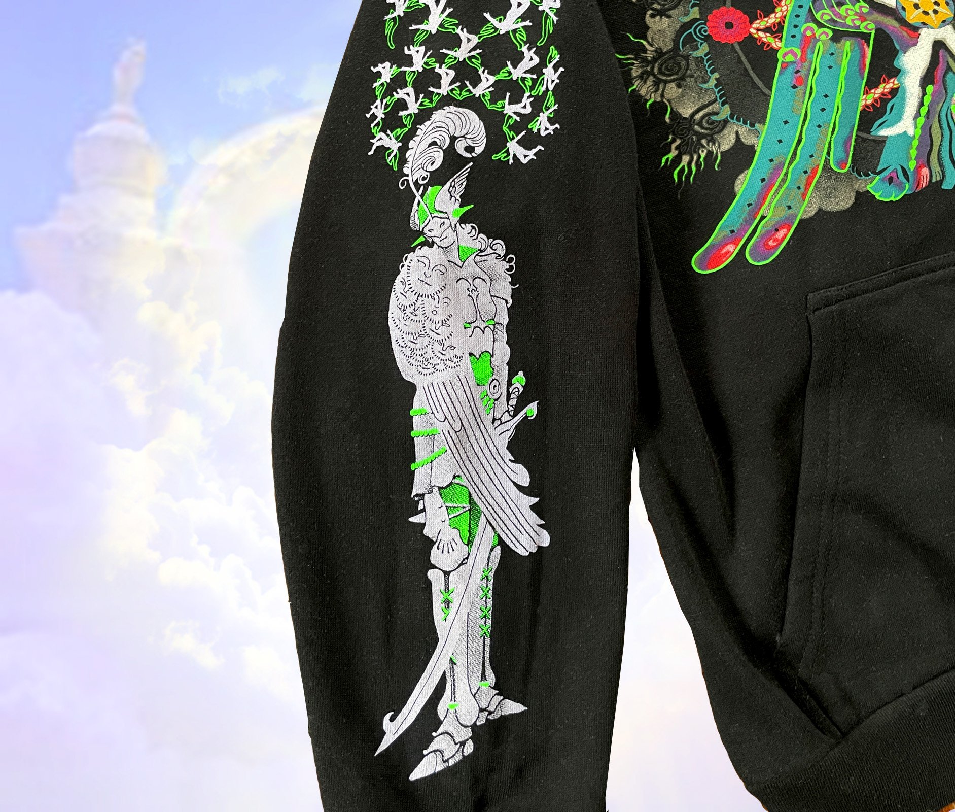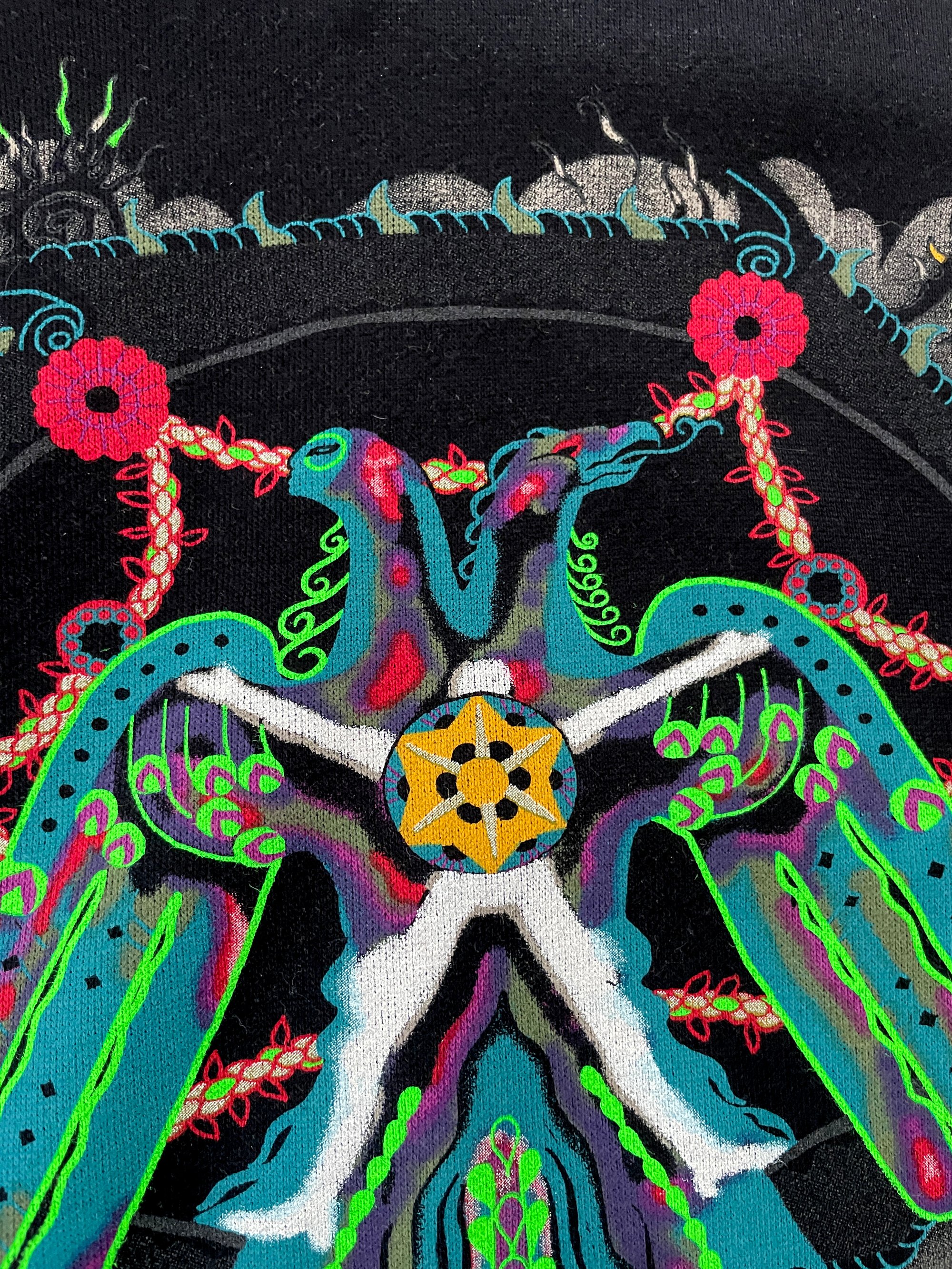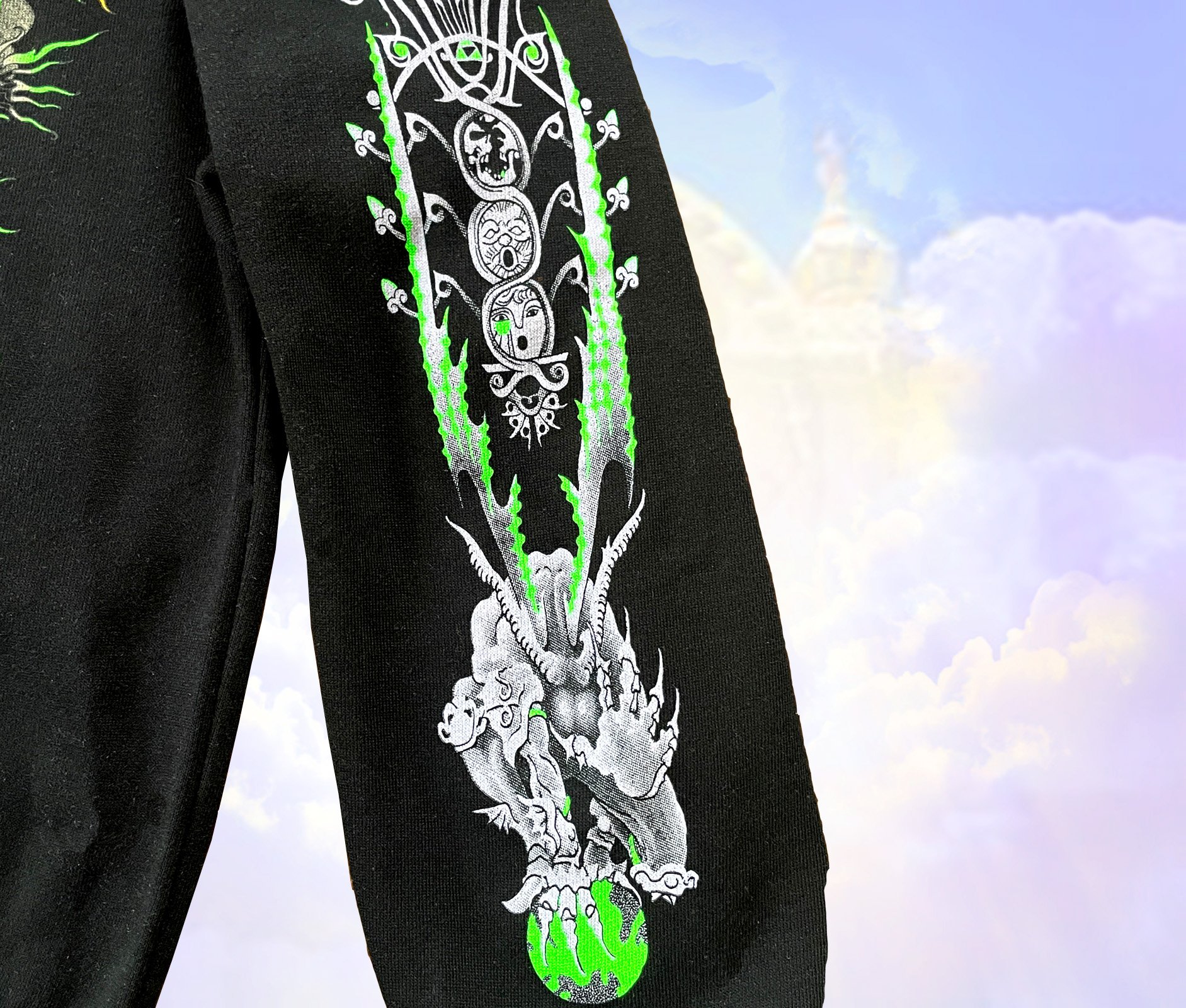 Full color screen-print on chest with reflective ink, 2 color print on each sleeve with fluorescent green.