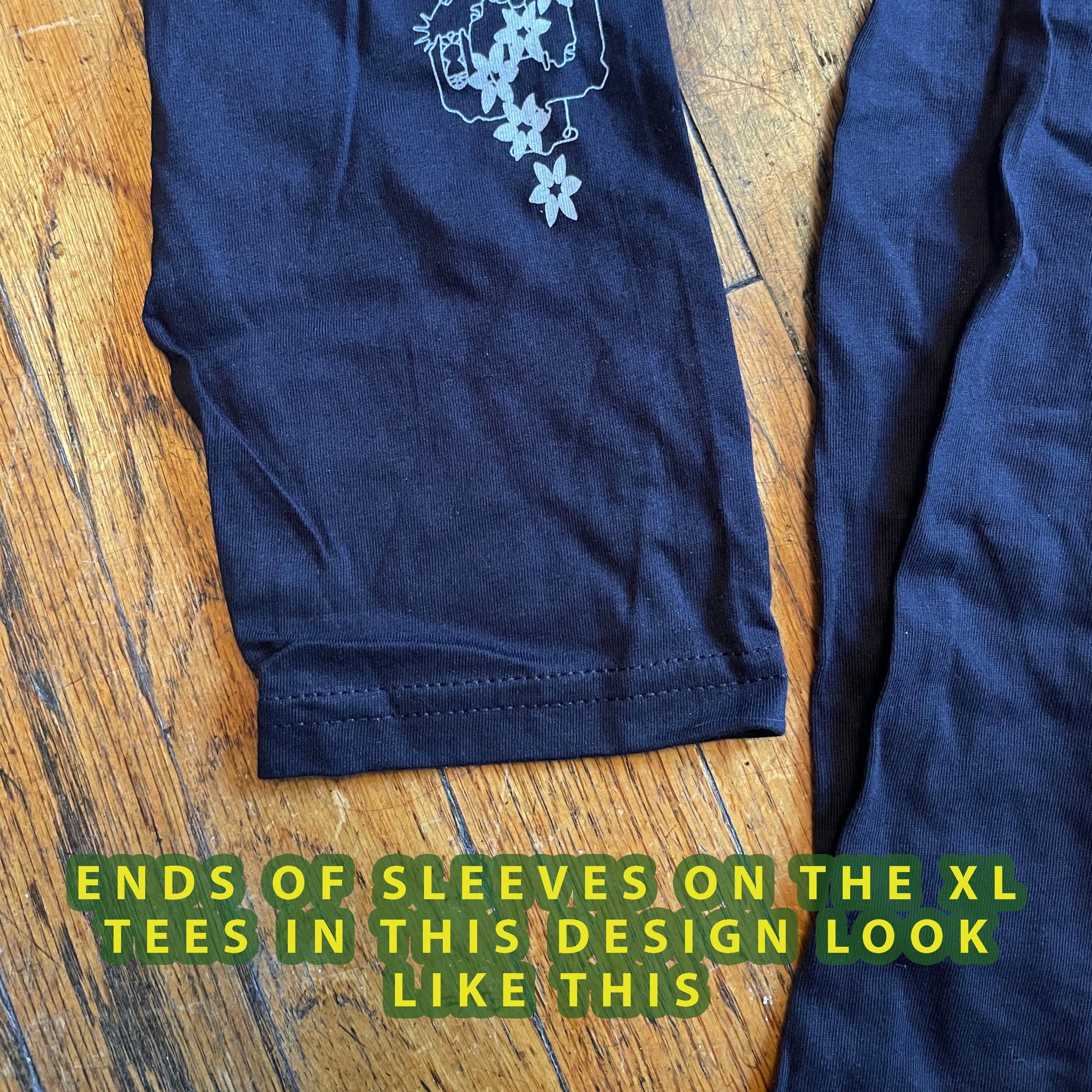 Please look thru the detail shots to see how the ends of the sleeves look on the XL sizes of this design. Due to some last minute printing issues the XLs were printed on Bayside Unisex Lightweight tees with an open ended sleeve.